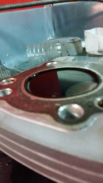 Y tras sacar las culatas verificamos que los asientos de las válvulas estaban bien. Para ello se ponen las culatas boca abajo, horizontales, y se llenan las cámaras de gasolina. Si el nivel se mantiene y no baja gasolina por las toberas de admisión o escape es que están bien. Claro, con las bujías colocadas. Gracias Ed China por estos trucos.